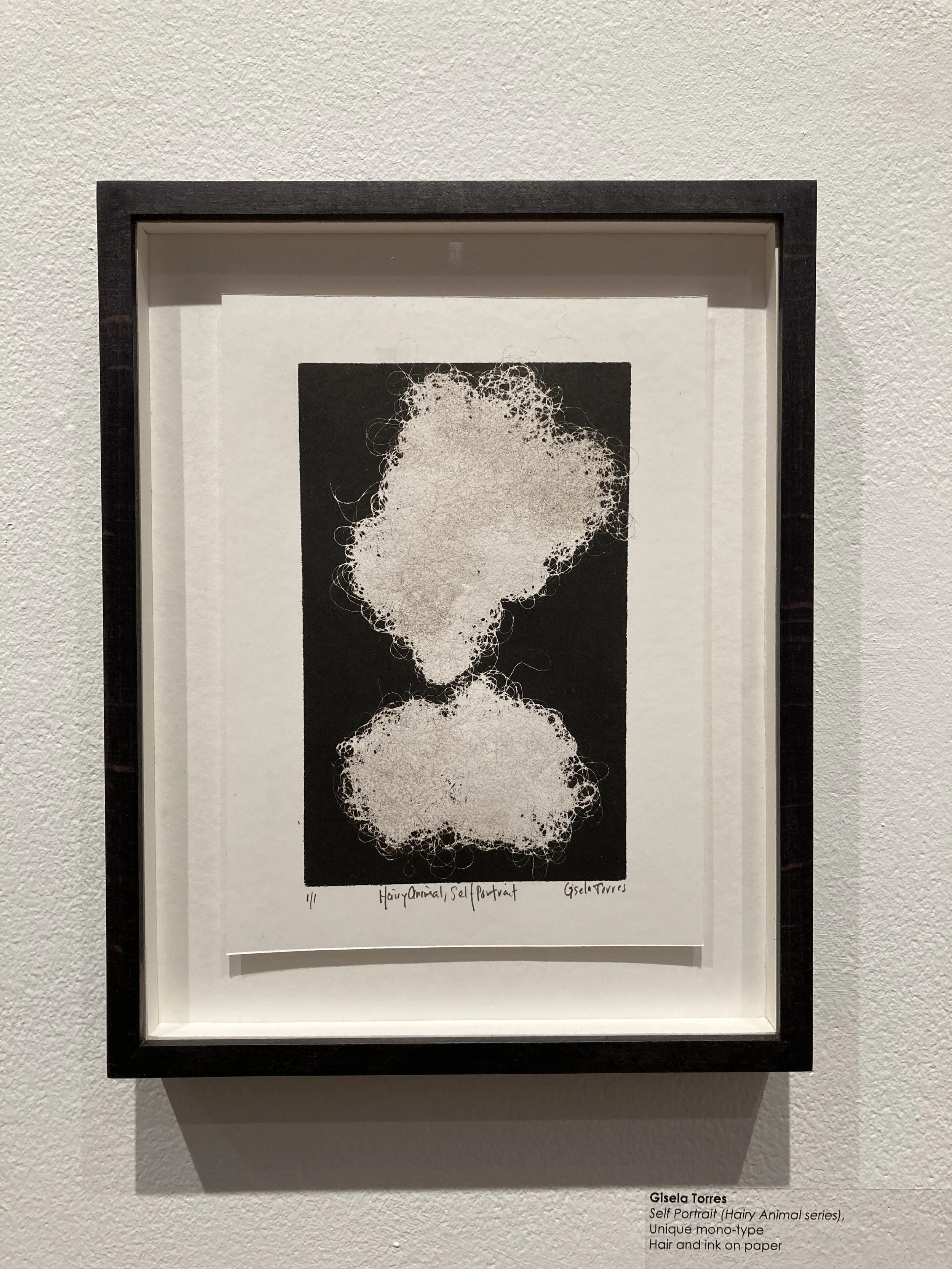 Hairy Animal, Hair Stories (Self-Portrait), is an ongoing project series of mono-type studies made using Torres’s own hair as a mark making tool to create an indexical trace containing her unique DNA.